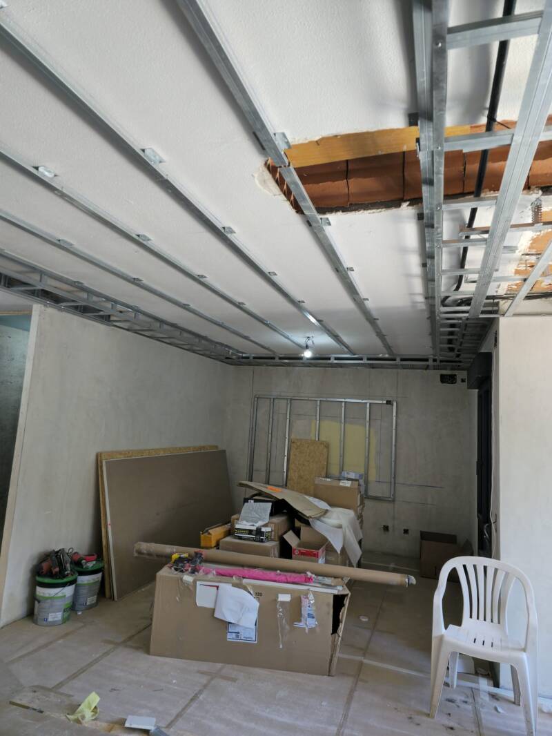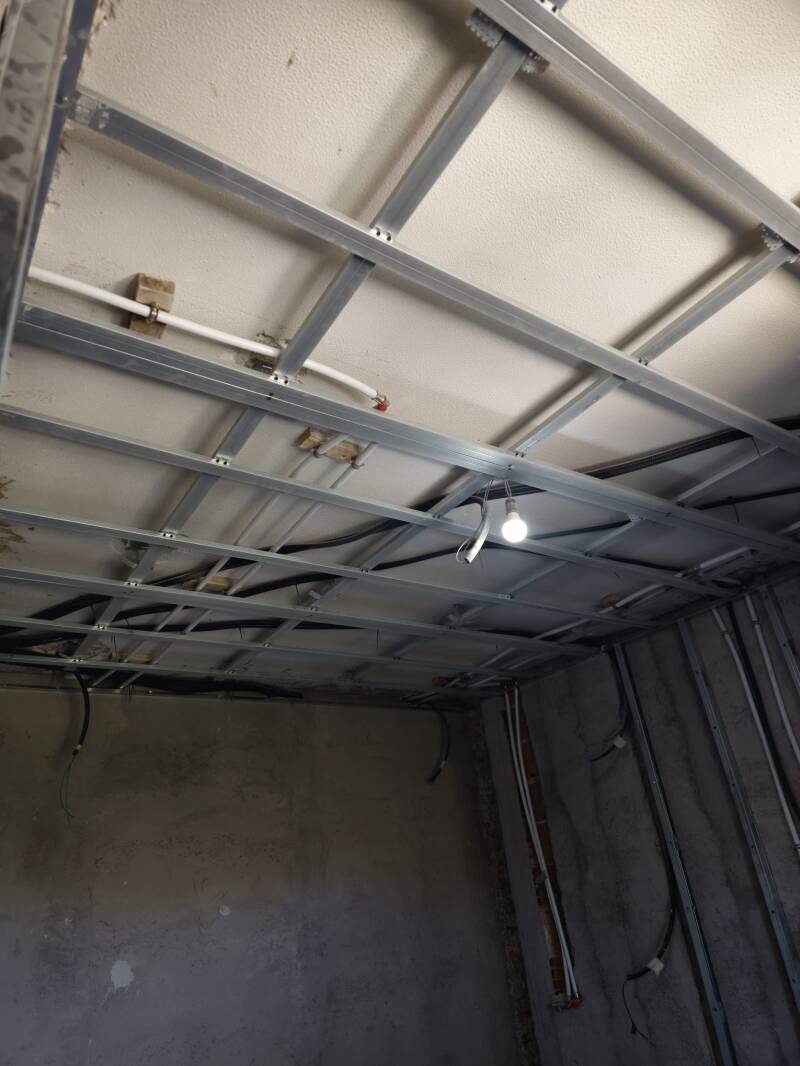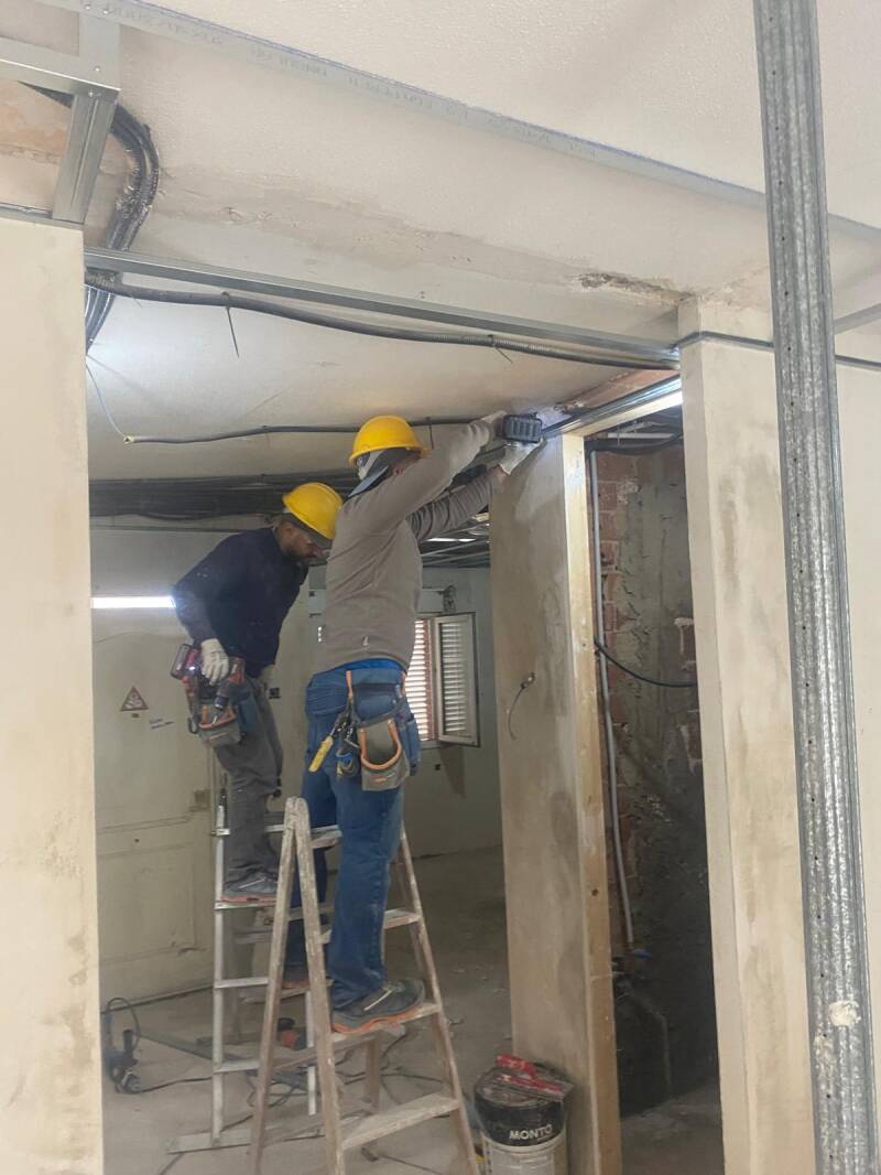 En esta septima etapa primero realizaremos el armado de la estructura del techo con perfiles de hierro galvanizado en las tres plantas, posteriormente hicimos la instalacion de las placas de yeso revistiendo todas las superficies donde se encuentran los ductos electricos y de fontaneria.