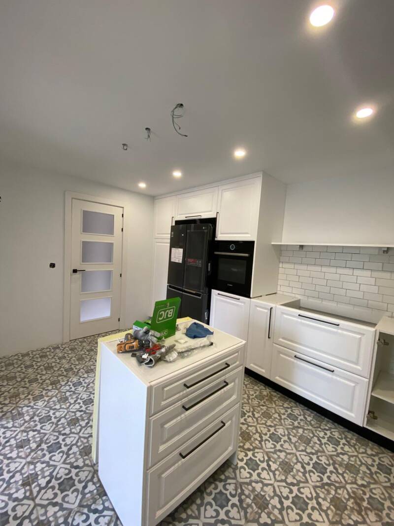 Luego de haber planificado y replanteado todas las areas seguimos con la segunda etapa para hacer las nuevas instalaciones de: nuevas redes de sistema de agua fria y caliente de baño y cocina, nueva red de desagues, sistema de calefaccion para radiadores, distribucion electrica completa para nuevos enchufes e interruptores, nueva red de iluminacion, nueva pavimentacion, colocacion de falso techo de pladur, colocacion de solados y rodapies, armado e instalacion de puertas, instalacion de tarima flotante, alicatado de las paredes de baños y cocina, armado e instalacion de muebles de baño: lavabo, water, griferia, espejo, radiador, mampara y plato de ducha, como tambien el armado e instalacion de los muebles de cocina y por ultimo el enlucido de las paredes y techos con masillado, lijado y pintado en toda la vivienda.